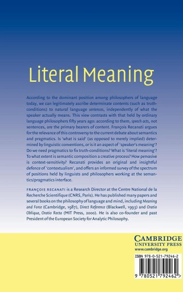 Franç ois Recanati provides an original defense of "contextualism" in contribution to the current debate about the best definition of semantics and pragmatics. Is "What is said" determined by linguistic conventions, or is it an aspect of "speaker's meaning"? Do we need pragmatics to fix truth-conditions? What is "literal meaning"? To what extent is semantic composition a creative process? How pervasive is context-sensitivity? Recanati offers an informed survey of the spectrum of positions held by linguists and philosophers working at the semantics/pragmatics interface.