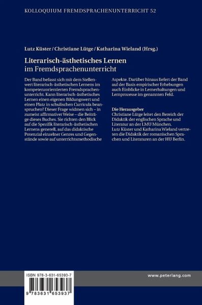 Inhalt: Lutz Küster: Warum ästhetisch-literarisches Lernen im Fremdsprachenunterricht? Ausgewählte theoretische Fundierungen - Ralf Weskamp:Geschichten und Literatur: Kommunikation, Wissens- und Spracherwerb im fremdsprachlichen Unterricht - Katharina Wieland: Zu motivationalen Aspekten literarischen Lesens im Fremdsprachenunterricht - Birgit Schädlich/Carola Surkamp:Textrezeptionsprozesse von Schülerinnen und Schülern in handlungsorientierten Unterrichtsszenarien: Unterrichtsvideographie im fremdsprachlichen Literaturunterricht - Katharina Kräling/Katharina Martín Fraile/Daniela Caspari: Literarästhetisches Lernen mit komplexen Lernaufgaben fördern?! - Barbara Schmenk: Jenseits von Ganzheitlichkeit? Bildungspotenziale im dramapädagogischen Fremdsprachenunterricht - Domenica Elisa Cicala:Testi letterari e audiovisivi a lezione. Tra teoria e pratica didattica - Janina Vernal Schmidt:Kulturwissenschaftliche Zugänge zu Filmanalysen. Ein Beitrag zum Spanischunterricht der Sekundarstufe II - Meike Hethey: Je sais ce que moi-même je dois à la littérature... Anbahnung von literarisch-ästhetischem Lesen mit dem Einsatz frankophoner Jugendliteratur - Annika Aulf: Autofiktionale Texte als Anlässe von Selbstreflexion und Persönlichkeitsbildung - Wolfgang Hallet:Literarisches und multiliterales Lernen mit graphic novels im Fremdsprachenunterricht.