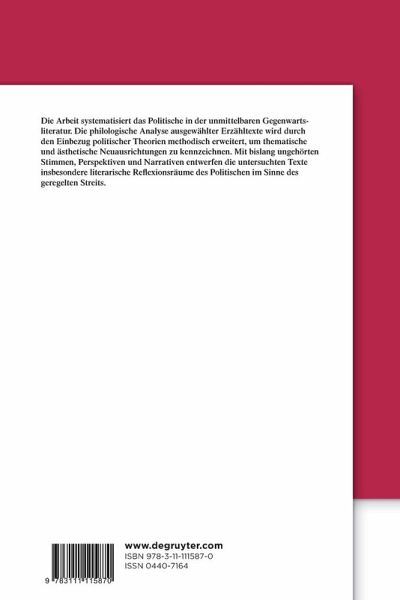 Die Arbeit systematisiert das Politische in der unmittelbaren Gegenwartsliteratur. Die philologische Analyse ausgewählter Erzähltexte wird dabei unter Einbezug politischer Theorien methodisch erweitert, um thematische und ästhetische Neuausrichtungen zu kennzeichnen. Mit bislang ungehörten Stimmen, Perspektiven und Narrativen entwerfen die untersuchten Texte insbesondere literarische Reflexionsräume des Politischen im Sinne des geregelten Streits.