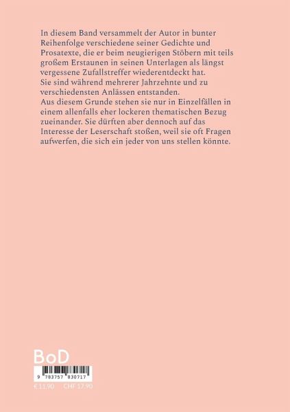 In diesem Band versammelt der Autor in bunter Reihenfolge verschiedene seiner Gedichte und Prosatexte, die er beim neugierigen Stöbern mit teils großem Erstaunen in seinen Unterlagen als längst vergessene Zufallstreffer wiederentdeckt hat. Sie sind während mehrerer Jahrzehnte und zu verschiedensten Anlässen entstanden.Aus diesem Grunde stehen sie nur in Einzelfällen in einem allenfalls eher lockeren thematischen Bezug zueinander. Sie dürften aber dennoch auf das Interesse der Leserschaft stoßen, weil sie oft Fragen aufwerfen, die sich ein jeder von uns stellen könnte.