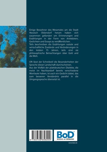 Einige Bewohner des Wesertales um die Stadt Hessisch Oldendorf herum haben sich zusammengefunden, um Erinnerungen und Erzählungen in der Form von Anekdoten, Gedichten und Essays zu veröffentlichen. Teils beschreiben die Erzählungen soziale und wirtschaftliche Zustände und Veränderungen in den letzten 75 Jahren, teils sind sie philosophische Betrachtungen über Gott und die Welt. Oft lässt der Schreibstil die Besonderheiten der Sprache dieser Landschaft durchscheinen. Aus der Vielfalt der plattdeutschen Dialekte, die meist im Nachbardorf bereits verschiedene Wortlaute haben, ist auch ein Gedicht dabei, das zum besseren Verständnis parallel in die Umgangssprache übersetzt ist.