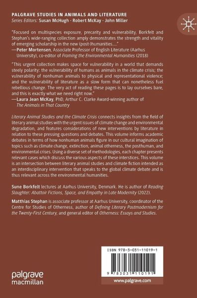 Introduction Sune Borkfelt and Matthias Stephan.- Part 1: Extinction.- Sara Schotland Do Humans Dream of Disappearing Insects?.- Nathaniel Otjen The Climate of Extinction: Resistant Multispecies Communities in Barbara Kingsolver's Flight Behavior and Richard Powers's The Overstory.- Abby Schroering Playing Against Extinction: "The Dreaded Comparison" and the Distribution of the Human in Mlima's Tale.- Brianna Burke Anthropomorphization and Conjoined Extinction in "The Great Silence" by Ted Chiang and Sila by Chantal Bilodeau.- Part 2: Climate Crisis.- Emily McAvan "Undoing Creation in the Climate Change Apocalypse: Animality and Evolution in Louise Erdrich's Future Home of the Living God".- Alex Lockwood Hopping, crawling, hiding: creatural movements on the path to climate emergency.- Markku Lehtimaki Polar Bears and Butterflies: Allegory, Science, and Embodiment in Climate Change Fiction.- Elana Santana Bodies Tell Stories: Race, Species, and Climate Change in Jesmyn Ward's novel, Salvagethe Bones.- Anastassiya Adrianova A Spokesbear for Climate Crisis? The Role of Zoos in Yoko Tawada's Memoirs of a Polar Bear.- Part 3: Posthuman.- Dolly Jørgensen Resurrecting Species through Robotics: Animal Extinction and Deextinction in Do Androids Dream of Electric Sheep?.- Aaron Van Neste Alien Oceans as Climate Salvation: Finding Hope in the Deep Blue Unknown.- Daniel Bedggood Ecocrises and Posthuman-Animal Futures in Bacigalupi's The Windup Girl and Schoen's Barsk.