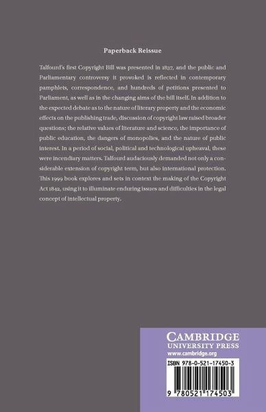 Talfourd's first Copyright Bill was presented in 1837, and the public and Parliamentary controversy it provoked is reflected in contemporary pamphlets, correspondence, and hundreds of petitions presented to Parliament, as well as in the changing aims of the bill itself. In addition to the expected debate as to the nature of literary property and the economic effects on the publishing trade, discussion of copyright law raised broader questions; the relative values of literature and science, the importance of public education, the dangers of monopolies, and the nature of public interest. In a period of social, political and technological upheaval, these were incendiary matters. Talfourd audaciously demanded not only a considerable extension of copyright term, but also international protection. This book explores and sets in context the making of the Copyright Act 1842, using it to illuminate enduring issues and difficulties in the legal concept of intellectual property.