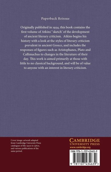 Originally published in 1934, this book contains the first volume of Atkins' 'sketch' of the development of ancient literary criticism. Atkins begins his history with a look at the styles of literary criticism prevalent in ancient Greece, and includes the responses of figures such as Aristophanes, Plato and Callimachus to changes in the literature of their day. This work is aimed primarily at those with little to no classical background, and will be of value to anyone with an interest in literary criticism.