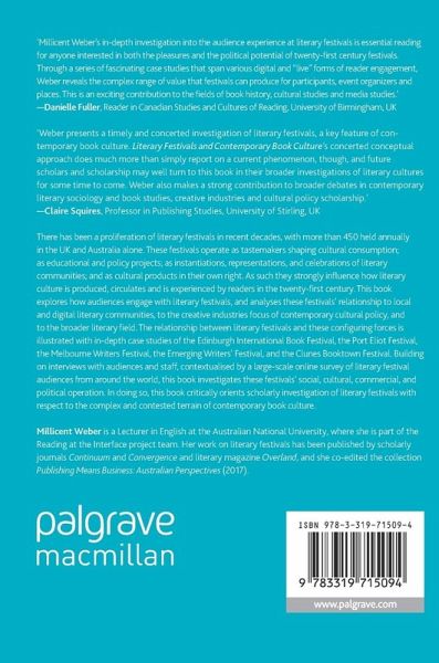 There has been a proliferation of literary festivals in recent decades, with more than 450 held annually in the UK and Australia alone. These festivals operate as tastemakers shaping cultural consumption; as educational and policy projects; as instantiations, representations, and celebrations of literary communities; and as cultural products in their own right. As such they strongly influence how literary culture is produced, circulates and is experienced by readers in the twenty-first century. This book explores how audiences engage with literary festivals, and analyses these festivals' relationship to local and digital literary communities, to the creative industries focus of contemporary cultural policy, and to the broader literary field. The relationship between literary festivals and these configuring forces is illustrated with in-depth case studies of the Edinburgh International Book Festival, the Port Eliot Festival, the Melbourne Writers Festival, the Emerging Writers'Festival, and the Clunes Booktown Festival. Building on interviews with audiences and staff, contextualised by a large-scale online survey of literary festival audiences from around the world, this book investigates these festivals' social, cultural, commercial, and political operation. In doing so, this book critically orients scholarly investigation of literary festivals with respect to the complex and contested terrain of contemporary book culture.