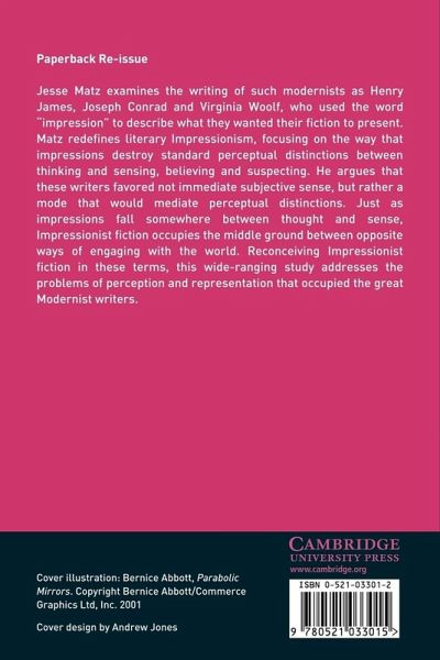 Jesse Matz examines the writing of such modernists as Henry James, Joseph Conrad and Virginia Woolf, who used the word 'impression' to describe what they wanted their fiction to present. Matz redefines literary Impressionism, focusing on the way that impressions destroy standard perceptual distinctions between thinking and sensing, believing and suspecting. He argues that these writers favoured not immediate subjective sense, but rather a mode that would mediate perceptual distinctions. Just as impressions fall somewhere between thought and sense, Impressionist fiction occupies the middle ground between opposite ways of engaging with the world. Matz also argues that the resulting confusion becomes a basic plot feature of modernist fiction. This wide-ranging study addresses the problems of perception and representation that occupied writers in the early decades of the twentieth century.