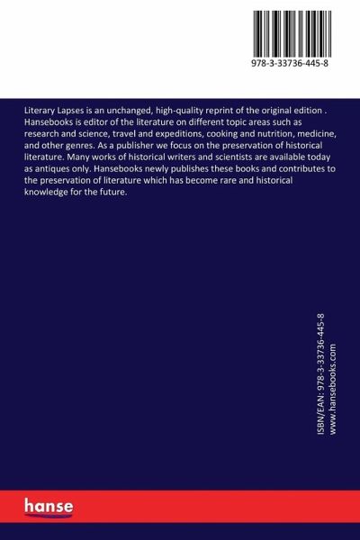 Literary Lapses is an unchanged, high-quality reprint of the original edition .Hansebooks is editor of the literature on different topic areas such as research and science, travel and expeditions, cooking and nutrition, medicine, and other genres. As a publisher we focus on the preservation of historical literature. Many works of historical writers and scientists are available today as antiques only. Hansebooks newly publishes these books and contributes to the preservation of literature which has become rare and historical knowledge for the future.