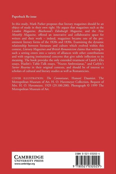 In this study, Mark Parker proposes that literary magazines should be an object of study in their own right. He argues that magazines such as the London Magazine, Blackwood's Edinburgh Magazine, and the New Monthly Magazine, offered an innovative and collaborative space for writers and their work - indeed, magazines became one of the pre-eminent literary forms of the 1820s and 1830s. Examining the dynamic relationship between literature and culture which evolved within this context, Literary Magazines and British Romanticism claims that writing in such a setting enters into a variety of alliances with other contributions and with ongoing institutional concerns that give subtle inflection to its meaning. The book provides an extended treatment of Lamb's Elia Essays, Hazlitt's Table-Talk Essays, Noctes Ambrosianae, and Carlyle's Sartor Resartus in their original contexts, and should be of interest to scholars of cultural and literary studies as well as Romanticists.