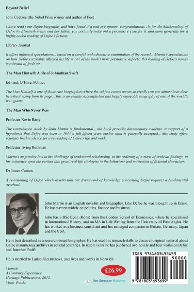 Beyond Belief John Coetzee (the Nobel Prize winner and author of Foe) I have read your Defoe biography and have found it a real eye-opener- congratulations. As for the blackmailing of Defoe by Elisabeth White and her father, you certainly make out a persuasive case for it, and more generally for a highly-coded reading of Defoe's fictions. Library Journal It offers informed speculations... based on a careful and exhaustive examination of the record... Martin's speculations on how Defoe's sexuality affected his life is one of the book's most persuasive aspects, this reading of Defoe's novels is a breath of fresh air. The Man Himself: A life of Johnathan Swift Edward, O'Hare, Politico The Man Himself is one of those rare biographies where the subject comes across so vividly you can almost hear their heartbeat rising from its page... this is an erudite accomplished and hugely enjoyable biography of one of the world's true giants. The Man Who Never Was Professor Kevin Barry The contribution made by John Martin is fundamental... the book provides documentary evidence in support of a hypothesis that Defoe was born in 1644 a full fifteen years earlier than is generally accepted... this study offers scholars fresh evidence for a re-reading of Defoe's life and work. Professor Irving Rothman Martin's originality lies in his challenge of traditional scholarship, in his ordering of a mass of archival findings, in his insistence upon the verities that grant real-life etiologies to the behaviour and motivation of fictional characters. Dr James Canton A re-visioning of Defoe which asserts that our framework of knowledge concerning Defoe requires a fundamental overhaul. Author biography John Martin is an English novelist and biographer. Like Defoe he was brought up in Essex. He has written widely on politics, finance and business. John has a BSc Econ (Hons) from the London School of Economics, where he specialised in International History, and an MA in Life Writing from the University of East Anglia. He has worked as a business consultant and has managed companies in Britain, Germany, Japan and the USA. He is best described as a research-based biographer. He has used his research skills to discover original material about Defoe in numerous archives in several countries. In recent years he has published two novels and four works on Defoe and Jonathan Swift. He is married to Larisa Kleymenova, and lives and works in Norwich.