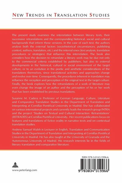 The present study examines the interrelation between literary texts, their successive retranslations and the corresponding historical, social and cultural backgrounds that inform these versions. In the case of each text, the authors analyse both the external factors (sociohistorical circumstances, publishing context, authors, translators, etc.) and the internal ones (text analysis, translation procedures or strategies) that influence this interrelation. The book also considers how the decision to retranslate a literary work may be due not only to the commercial criteria established by publishers, but also to external developments in the historical, cultural or social environment of the target culture, or to an evolution in the poetic and aesthetic considerations of the translations themselves, since translational activities and approaches change and evolve over time. Consequently, the procedures inherent in translation may influence the reception and perception of the original text in the target culture. Finally, the book explores how the retranslations of a work of literature may even change the image of an author and the perception of his or her work that has been established by previous translations.
