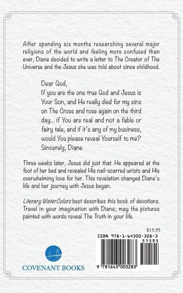 After spending six months researching several major religions of the world and feeling more confused than ever, Diane decided to write a letter to The Creator of The Universe and the Jesus she was told about since childhood. Dear God, If you are the one true God and Jesus is Your Son, and He really died for my sins on The Cross and rose again on the third day…if You are real and not a fable or fairy tale, and if it's any of my business, would You please reveal Yourself to me? Sincerely, Diane Three weeks later, Jesus did just that. He appeared at the foot of her bed and revealed His nail-scarred wrists and His overwhelming love for her. This revelation changed Diane's life and her journey with Jesus began. Literary WaterColors best describes this book of devotions. Travel in your imagination with Diane; may the pictures painted with words reveal The Truth in your life.