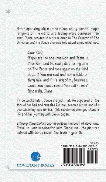 After spending six months researching several major religions of the world and feeling more confused than ever, Diane decided to write a letter to The Creator of The Universe and the Jesus she was told about since childhood. Dear God, If you are the one true God and Jesus is Your Son, and He really died for my sins on The Cross and rose again on the third day…if You are real and not a fable or fairy tale, and if it's any of my business, would You please reveal Yourself to me? Sincerely, Diane Three weeks later, Jesus did just that. He appeared at the foot of her bed and revealed His nail-scarred wrists and His overwhelming love for her. This revelation changed Diane's life and her journey with Jesus began. Literary WaterColors best describes this book of devotions. Travel in your imagination with Diane; may the pictures painted with words reveal The Truth in your life.