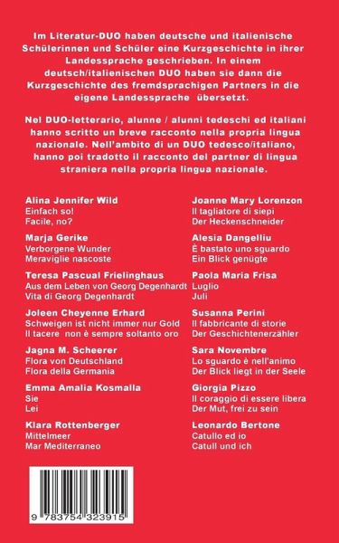 Im Literatur-DUO haben deutsche und italienische Schülerinnen und Schüler eine Kurzgeschichte in ihrer Landessprache geschrieben. In einem deutsch/italienischen DUO haben sie dann die Kurzgeschichte des fremdsprachigen Partners in die eigene Landessprache übersetzt. Die Autoren und Autorinnen Alina Jennifer Wild / Joanne Mary LorenzonEinfach so! / Il tagliatore di siepiFacile, no? / Der HeckenschneiderMarja Gerike / Alesia DangelliuVerborgene Wunder / È bastato uno sguardoMeraviglie nascoste / Ein Blick genügteTeresa Pascual Frielinghaus / Paola Maria FrisaAus dem Leben von Georg Degenhardt / Luglio Vita di Georg Degenhardt / JuliJoleen Cheyenne Erhard / Susanna PeriniSchweigen ist nicht immer nur Gold / Il fabbricante di storie Il tacere non è sempre soltanto oro / Der Geschichtenerzähler Jagna M. Scheerer / Sara NovembreFlora von Deutschland / Lo sguardo è nell'animoFlora della Germania / Der Blick liegt in der Seele Emma Amalia Kosmalla / Giorgia PizzoSie / Il coraggio di essere liberaLei / Der Mut, frei zu seinKlara Rottenberger / Leonardo BertoneMittelmeer / Catullo ed ioMar Mediterraneo / Catull und ich