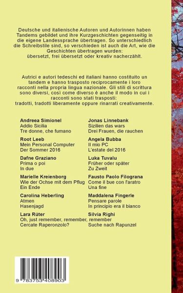 Deutsche und italienische Autoren und Autorinnen haben Tandems gebildet und ihre Kurzgeschichten gegenseitig in die eigene Landessprache übertragen. So unterschiedlich die Schreibstile sind, so verschieden ist auch die Art, wie die Geschichten übertragen wurden:übersetzt, frei übersetzt oder kreativ nacherzählt.Die Autoren und Autorinnen:Andreea Simionel / Jonas LinnebankAddio Sicilia / Sizilien das warsDrei Frauen, die rauchen / Tre donne, che fumanoRoot Leeb / Angela BubbaMein Personal Computer / Il mio PCL estate del 2016 / Der Sommer 2016Dafne Graziano / Luka TuvaluPrima o poi / Früher oder späterZu Zweit / In dueMarielle Kreienborg / Fausto Paolo FilogranaWie der Ochse mit dem Pflug / Come il bue con l'aratroUna fine / Ein EndeCarolina Heberling / Maddalena FingerleAtmen / Pensare paroleIn principio era il bianco / HasenjagdLara Rüter / Silvia RighiOh, just remember, remember, remember Cercate Raperonzolo? / Suche nach Rapunzel?