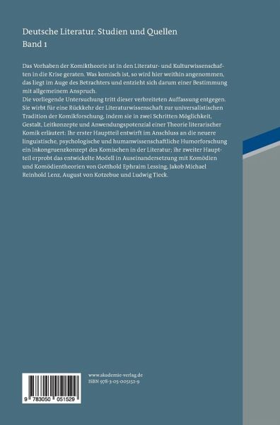 Das Vorhaben der Komiktheorie ist in den Literatur- und Kulturwissenschaften in die Krise geraten. Was komisch ist, so wird hier weithin angenommen, das liegt im Auge des Betrachters und entzieht sich darum einer Bestimmung mit allgemeinem Anspruch. Die vorliegende Untersuchung tritt dieser verbreiteten Auffassung entgegen - sie wirbt für eine Rückkehr der Literaturwissenschaft zur universalistischen Tradition der Komikforschung, indem sie in zwei Schritten Möglichkeit, Gestalt, Leitkonzepte und Anwendungspotenzial einer Theorie literarischer Komik erläutert: Ihr erster Hauptteil entwirft im Anschluss an die neuere linguistische, psychologische und humanwissenschaftliche Humorforschung ein Inkongruenzkonzept des Komischen in der Literatur; ihr zweiter Hauptteil erprobt das entwickelte Modell in Auseinandersetzung mit Komödien und Komödientheorien von Gotthold Ephraim Lessing, Jakob Michael Reinhold Lenz, August von Kotzebue und Ludwig Tieck.