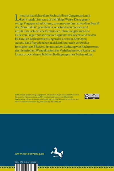 Literatur hat nicht selten Recht als ihren Gegenstand, und Recht regelt Literatur auf vielfältige Weise. Diese gegenseitige Vergegenständlichung, zusammengefasst unter dem Begriff der "Materialität", geschieht in verschiedenen Formen und erfüllt unterschiedliche Funktionen. Daraus ergibt sich eine Fülle von Fragen zur normativen Qualität des Rechts und zu den kulturellen Reflexionsleistungen der Literatur. Der Band fragt daneben auch konkreter nach der Rechtsförmigkeit des Fiktiven, der narrativen Ordnung von Rechtstexten, der historischen Wandelbarkeit des Verhältnisses von Recht und Literatur oder den rechtlichen Bedingungen des Buchmarktes. Dies ist ein Open-Access-Buch.