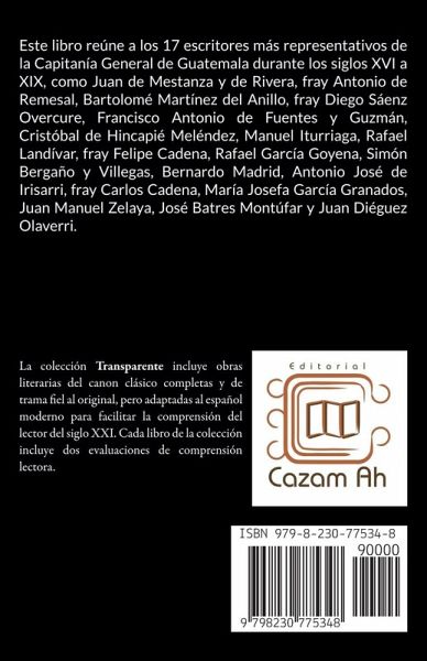 Este libro reúne a los 17 escritores más representativos de la Capitanía General de Guatemala durante los siglos XVI a XIX, como Juan de Mestanza y de Rivera, fray Antonio de Remesal, Bartolomé Martínez del Anillo, fray Diego Sáenz Overcure, Francisco Antonio de Fuentes y Guzmán, Cristóbal de Hincapié Meléndez, Manuel Iturriaga, Rafael Landívar, fray Felipe Cadena, Rafael García Goyena, Simón Bergaño y Villegas, Bernardo Madrid, Antonio José de Irisarri, fray Carlos Cadena, María Josefa García Granados, Juan Manuel Zelaya, José Batres Montúfar y Juan Diéguez Olaverri. Literatura guatemalteca colonial pertenece a la colección Transparente que incluye obras literarias del canon clásico completas y de trama fiel al original, pero adaptadas al español moderno para facilitar la comprensión del lector del siglo XXI. Cada libro de la colección incluye una evaluación en línea para el lector y una evaluación de comprensión lectora descargable para el docente; dicha evaluación aborda las competencias interpretativa, argumentativa y propositiva.