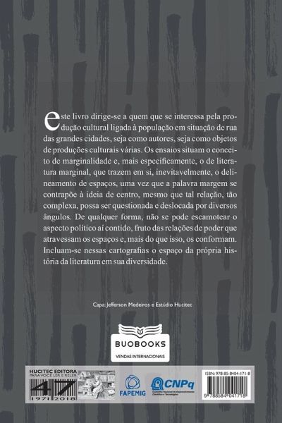 Este livro dirige-se a quem se interessa pela produção cultural ligada à população em situação de rua das grandes cidades, seja como autores, seja como objetos de produção culturais várias. Os ensaios situam o conceito de marginalidade e, mais especificamente, o de literatura marginal, que trazem em si, inevitavelmente, o delineamento de espaços, uma vez que a palavra margem se contrapõe à ideia de centro, mesmo que tal relação, tão complexa, possa ser questionada e deslocada por diversos ângulos. De qualquer forma, não se pode escamotear o aspecto político aí contido, fruto das relações de poder que atravessam os espaços e, mais do que isso, os conformam. Incluam-se nessas cartografias o espaço da própria história da literatura em sua diversidade.