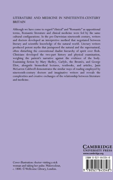 Although we have come to regard 'clinical' and 'romantic' as oppositional terms, romantic literature and clinical medicine were fed by the same cultural configurations. In the pre-Darwinian nineteenth century, writers and doctors developed an interpretive method that negotiated between literary and scientific knowledge of the natural world. Literary writers produced potent myths that juxtaposed the natural and the supernatural, often disturbing the conventional dualist hierarchy of spirit over flesh. Clinicians developed the two-part history and physical examination, weighing the patient's narrative against the evidence of the body. Examining fiction by Mary Shelley, Carlyle, the Brontës and George Eliot, alongside biomedical lectures, textbooks and articles, Janis McLarren Caldwell demonstrates the similar ways of reading employed by nineteenth-century doctors and imaginative writers and reveals the complexities and creative exchanges of the relationship between literature and medicine.