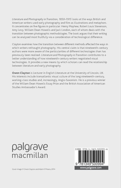 Literature and Photography in Transition, 1850-1915 examines how British and American writers used early photography and film as illustrations and metaphors. It concentrates on five figures in particular: Henry Mayhew, Robert Louis Stevenson, Amy Levy, William Dean Howells, and Jack London.