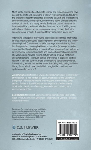 Essays exploring interrelated strands of material ecologies, past and present British politics, and the act of writing, through a rich variety of case studies. Much as the complexities of climate change and the Anthropocene have queried the limits and exclusions of literary representation, so, too, have the challenges recently presented by climate activism and intersectional environmentalism, animal rights, and even the power of material forms, such as oil, plastic, and heavy metals. Social and protest movements have revived the question of whether there can be such a thing as an activist ecocriticism: can such an approach only concern itself with consciousness, or might it politicise literary criticism in a new way? Attempting to respond, this volume coalesces around three interrelated strands: material ecologies, past and present British politics, and the act of writing itself. Contributors consider the ways in which literary form has foregrounded the complexities of both matter (in essays on water, sugar, and land) and political economics (from empire and nationalism to environmental justice movements and local and regional communities). The volume asks how life writing, nature writing, creative nonfiction, and autobiography - although genres entrenched in capitalist political realities - can also confront these by reinserting personal experience. Can we bring a more sustainable planet into being by focusing on those literary forms which have the ability to imagine the conditions and systems needed to do so?