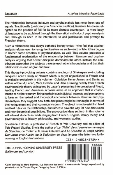Shoshana Feldman is professor of French at Yale University and an editor of Yale French Studies. She is the author of La "Folie" dans l'oeuvre romanesque de Stendhal, and La "Folie" at la chose Litteraire.
