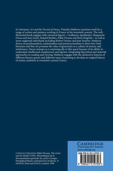 In Literature, Art and the Pursuit of Decay, Timothy Mathews examines work by a range of writers and painters working in France in the twentieth century. The well-illustrated book engages with canonical figures - Guillaume Apollinaire, Marguerite Duras and Jean Genet, Roland Barthes, Pablo Picasso and René Magritte - as well as more neglected individuals including Robert Desnos and Jean Fautrier. Mathews draws on psychoanalysis, existentialism and poststructuralism to show how both literature and fine art promote the value of generosity in a culture of anxiety and intolerance. Decay emerges as a surprising ally in this quest because of its ability to undermine intellectual complacency and egoism. Integrating theoretical and material approaches to reading and viewing, Mathews engages with the distinctive features of different literary genres and different types of painting to develop an original history of artistic ambition in twentieth-century France.