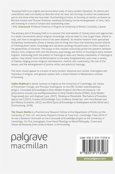 1. Crossroads of Knowledge: Literature and Theology - Subha Mukherji.- 2. Erasmus on Literature and Knowledge - Brian Cummings.- 3. The Hermeneutics of Richard Hooker's Defence of the "Sensible Excellencie" of Public Worship' - W. J. Torrance Kirby.- 4. Seeing and Believing: Thomas Traherne's Poetic Language and the Reading Eye' - Jane Partner.- 5. The Absence of Epistemology, or Drama and Divinity before Descartes - Debora Shuger.- 6. 'Qui enim securus est, minime securus est': The Paradox of Securitas in Luther and Beyond' - Giles Waller.- 7. Allegory and Religious Fanaticism: Spenser's Organs of Divine Might - Ross Lerner.- 8. What the Nose Knew: Renaissance Theologies of Smell - Sophie Read.- 9. Nosce Teipsum: The Senses of Self-knowledge in Early Modern England - Elizabeth L. Swann.- 10. Knowing and Forgiving - Regina Schwarz.- 11. How to Do Things with Belief - Ethan Shagan.- 12. Locke's Cicero: Between Moral Knowledge and Faith- Tim Stuart-Buttle.- 13. Afterword - Rowan Williams.