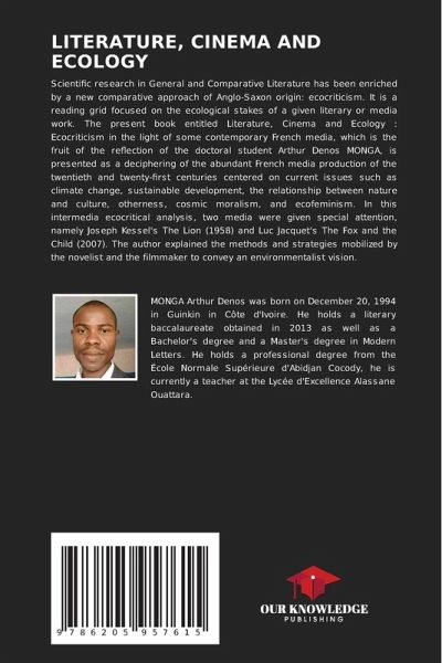 Scientific research in General and Comparative Literature has been enriched by a new comparative approach of Anglo-Saxon origin: ecocriticism. It is a reading grid focused on the ecological stakes of a given literary or media work. The present book entitled Literature, Cinema and Ecology : Ecocriticism in the light of some contemporary French media, which is the fruit of the reflection of the doctoral student Arthur Denos MONGA, is presented as a deciphering of the abundant French media production of the twentieth and twenty-first centuries centered on current issues such as climate change, sustainable development, the relationship between nature and culture, otherness, cosmic moralism, and ecofeminism. In this intermedia ecocritical analysis, two media were given special attention, namely Joseph Kessel's The Lion (1958) and Luc Jacquet's The Fox and the Child (2007). The author explained the methods and strategies mobilized by the novelist and the filmmaker to convey an environmentalist vision.