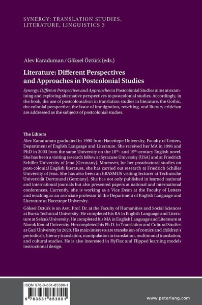 Synergy: Different Perspectives and Approaches in Postcolonial Studies aims at examining and exploring alternative perspectives to postcolonial studies. Accordingly, in the book, the use of postcolonialism in translation studies in literature, the Gothic, the colonial perspective, the issue of immigration, rewriting, and literary criticism are addressed as the subjects of postcolonial studies.