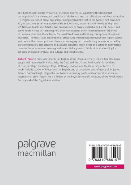 This book focuses on the twin arts of literature and music, supporting the notion that cosmopolitanism is the natural condition of all the arts, and that all culture - without exception - is migrant culture. It draws on examples ranging from the first to the twenty-first centuries AD, on locations as remote as Alexandria and Australia, on writers as different as Virgil and V.S.Naipaul, Arnold and Achebe, and on musicians as diverse as Bach and Bartok, Purcell and Steve Reich. Across thirteen chapters, the study explores the interpenetration of all forms of human expression, the fallacy of 'national' traditions and limiting conceptions of regional character. The result is an exploration of artistic and intellectual endeavour that is particularly welcome in the current political climate, encouraging us to view history in ways informed by our contemporary demographic and cultural concerns. Taken either as a series of interrelated case studies, or else as an evolving and sequential argument, this book is vital reading for scholars of music, literature, and cultural and social history.
