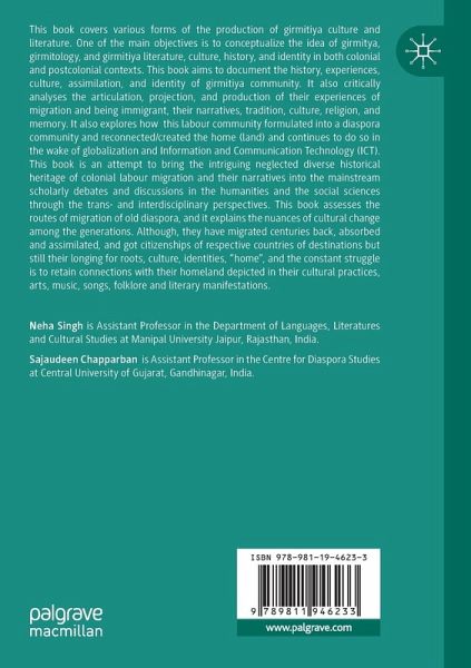 This book covers various forms of the production of girmitiya culture and literature. One of the main objectives is to conceptualize the idea of girmitya, girmitology, and girmitiya literature, culture, history, and identity in both colonial and postcolonial contexts. This book aims to document the history, experiences, culture, assimilation, and identity of girmitiya community. It also critically analyses the articulation, projection, and production of their experiences of migration and being immigrant, their narratives, tradition, culture, religion, and memory. It also explores how this labour community formulated into a diaspora community and reconnected/created the home (land) and continues to do so in the wake of globalization and Information and Communication Technology (ICT). This book is an attempt to bring the intriguing neglected diverse historical heritage of colonial labour migration and their narratives into the mainstream scholarly debates and discussions in thehumanities and the social sciences through the trans- and interdisciplinary perspectives. This book assesses the routes of migration of old diaspora, and it explains the nuances of cultural change among the generations. Although, they have migrated centuries back, absorbed and assimilated, and got citizenships of respective countries of destinations but still their longing for roots, culture, identities, "home", and the constant struggle is to retain connections with their homeland depicted in their cultural practices, arts, music, songs, folklore and literary manifestations.