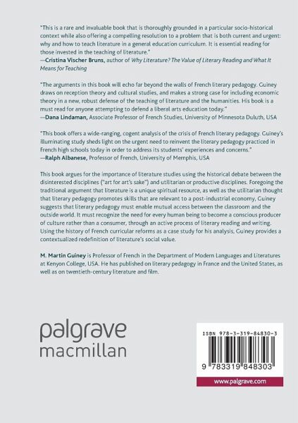 This book argues for the importance of literature studies using the historical debate between the disinterested disciplines ("art for art's sake") and utilitarian or productive disciplines. Forgoing the traditional argument that literature is a unique spiritual resource, as well as the utilitarian thought that literary pedagogy promotes skills that are relevant to a post-industrial economy, Guiney suggests that literary pedagogy must enable mutual access between the classroom and the outside world. It must recognize the need for every human being to become a conscious producer of culture rather than a consumer, through an active process of literary reading and writing. Using the history of French curricular reforms as a case study for his analysis, Guiney provides a contextualized redefinition of literature's social value.