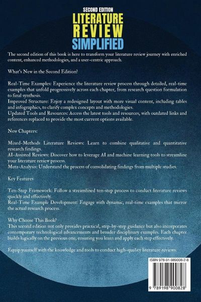 Equip yourself with the knowledge and tools to conduct high-quality literature reviews. This book is here to transform your literature review journey with enriched content, enhanced methodologies, and a user-centric approach. Key Features Ten-Step Framework: Follow a streamlined ten-step process to conduct literature reviews quickly and effectively. Real-Time Example Development: Engage with dynamic, real-time examples that mirror the actual research process. What's New in the Second Edition? Real-Time Examples: Experience the literature review process through detailed, real-time examples that unfold progressively across each chapter, from research question formulation to final synthesis. Improved Structure: Enjoy a redesigned layout with more visual content, including tables and infographics, to clarify complex concepts and methodologies. Updated Tools and Resources: Access the latest tools and resources, with outdated links and references replaced to provide the most current options available. New Chapters: Mixed-Methods Literature Reviews: Learn to combine qualitative and quantitative research findings. AI-Assisted Reviews: Discover how to leverage AI and machine learning tools to streamline your literature review process. Meta-Analysis: Understand the process of consolidating findings from multiple studies. Why Choose This Book? This second edition not only provides practical, step-by-step guidance but also incorporates contemporary technological advancements and broader disciplinary examples. Each chapter builds logically on the previous one, ensuring you learn and apply each step effectively.
