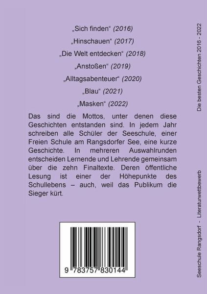 Seit 2016 schreiben die Schülerinnen und Schüler jedes Jahr kurze Geschichten, aus denen eine Jury aus Lehrenden und Lernenden die zehn besten Texte auswählt. Einer der Höhepunkte des Jahres ist die öffentliche Lesung dieser Finaltexte und das Votum des Publikums, das den Siegertext kürt. Der vorliegende Band versammelt die besten Geschichten der Jahre 2016 - 2022.2023 wurden die besten Geschichten der Jahre 2016 - 2022 im Rahmen des Kunstunterrichts illustriert und in einem Projekt in der letzten Schulwoche vor den Sommerferien entstand dieses Buch.