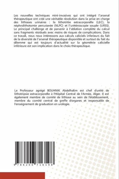 Les nouvelles techniques mini-invasives qui ont intégré l'arsenal thérapeutique ont créé une véritable révolution dans la prise en charge des lithiases urinaires : la lithotritie extracorporelle (LEC), la néphrolithotomie percutanée (NLPC) et l'urétéroscopie souple (URSS). Le principal challenge et de parvenir à l'ablation complète du calcul sans fragments résiduels avec moins de risques de complications. Dans ce travail, nous nous intéressons aux calculs caliciels inferieurs du fait de la diversité de l'arsenal thérapeutique disponible et surtout du fait du dilemme qui est toujours d'actualité sur la géométrie calicielle inférieure est son implication dans le choix thérapeutique.