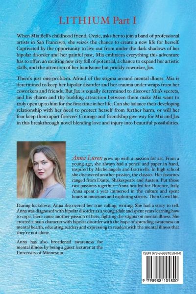 When Mia Bell's childhood friend, Ozzie, asks her to join a band of professional artists in San Francisco, she seizes the chance to create a new life for herself. Captivated by the opportunity to live out from under the dark shadows of her bipolar disorder and painful past, Mia embraces all this adventure has to offer: an exciting new city full of potential, a chance to expand her artistic skills, and the attention of her handsome but prickly coworker, Jax. There's just one problem. Afraid of the stigma around mental illness, Mia is determined to keep her bipolar disorder and trauma under wraps from her coworkers and friends. But Jax is equally determined to discover Mia's secrets, and his charm and the budding attraction between them make Mia want to truly open up to him for the first time in her life. Can she balance their developing relationship with her need to protect herself from further harm, or will her fear keep them apart forever? Courage and friendship give way for Mia and Jax in this breakthrough novel blending love and injury into beautiful possibilities.