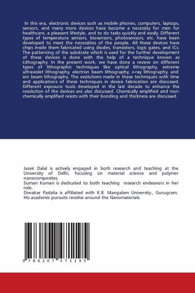 In this era, electronic devices such as mobile phones, computers, laptops, sensors, and many more devices have become a necessity for men for healthcare, a pleasant lifestyle, and to do tasks quickly and easily. Different types of temperature sensors, biosensors, photosensors, etc. have been developed to meet the necessities of the people. All these devices have chips inside them fabricated using diodes, transistors, logic gates, and ICs. The patterning of the substrate which is used for the further development of these devices is done with the help of a technique known as Lithography. In the present work, we have done a review on different types of lithographic techniques like optical lithography, extreme ultraviolet lithography, electron beam lithography, x-ray lithography, and ion beam lithography. The evolutions made in these techniques with time and applications of these techniques in device fabrication are discussed. Different exposure tools developed in the last decade to enhance the resolution of the devices are also discussed. Chemically amplified and non-chemically amplified resists with their bonding and thickness are discussed.