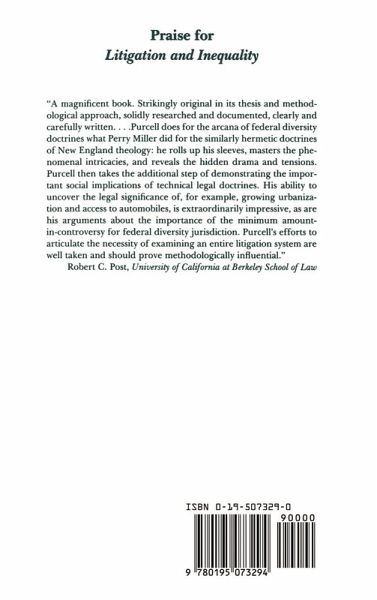 Litigation and Inequality explores the dynamic and intricate relationship between legal and social change through the prism of litigation tactics and out-of-court settlement practices from the 1870s to the 1950s. Developing the synthetic historical concept of a "social litigation system", Purcell analyzes the role of both substansive and procedural law, as well as the impact of social and political factors in shaping the de facto processes of litigation and claims-disputing. Focusing on tort and insurance contract disputes between individuals and national corporations, he examines the changing social and economic significance of the choice between state and national courts that federal diversity jurisdiction gave litigants. Litigation and Inequality scrutinizes the increasingly sophisticated methods that parties developed to exploit their ability to choose between forums. It also traces the changing responses of the courts and legislatures to the escalation of tactical maneuvering. It locates the origins of modern litigation practice in the quarter century after 1910. Purcell points to fundamental flaws in the "efficiency" theory of tort law of the late nineteenth and early twentieth century. He identifies specific ways in which the legal system regularly subsidized corporate enterprise. He seriously qualifies and refines the progressive charge that the federal courts favored business interests. The book argues that during the period from the turn of the century to World War I - especially the critical period from 1905 to 1908 - the Supreme Court reoriented the federal judicial system and essentially created the twentieth century federal judiciary. It also challenges the idea thatdiversity jurisdiction is best understood as a device to protect nonresidents from local prejudice. It illuminates a range of related historical and legal issues, from the ostensible "formalism" of the late nineteenth century judicial thinking to the origins of the workmen's