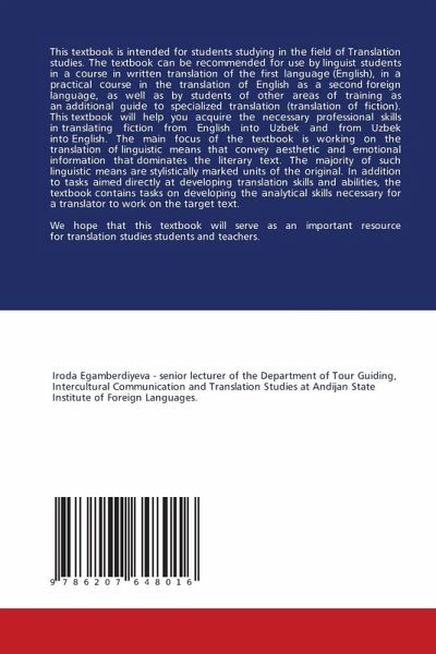 This textbook is int nd d f r stud nts studying in th fi ld f Tr nsl ti n studies. Th textbook n b r mm nd d f r us by linguist stud nts in urs in writt n tr nsl ti n f th first l ngu g ( nglish), in r ti l urs in th tr nsl ti n f nglish s s nd f r ign l ngu g , s w ll s by stud nts f th r r s f tr ining s n dditi n l guid t s i liz d tr nsl ti n (tr nsl ti n f fi ti n). This textbook will h l y u quir th n ss ry r f ssi n l skills in tr nsl ting fi ti n fr m nglish int Uzb k nd fr m Uzb k int nglish. Th m in f us f th textbook is w rking n th tr nsl ti n f linguisti m ns th t nv y sth ti nd m ti n l inf rm ti n th t d min t s th lit r ry t t. Th m j rity f su h linguisti m ns r stylisti lly m rk d units f th rigin l. In dditi n t t sks im d dir tly t d v l ing tr nsl ti n skills nd biliti s, th textbook nt ins t sks n d v l ing th n lyti l skills n ss ry f r tr nsl t r tw rk n th t rg t t t.We hope that this textbook will serve as an important resource for translation studies students and teachers.