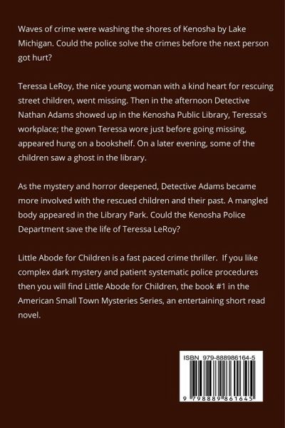 Waves of crime were washing the shores of Kenosha by Lake Michigan. Could the police solve the crimes before the next person got hurt? Teressa LeRoy, the nice young woman with a kind heart for rescuing street children, went missing. Then in the afternoon Detective Nathan Adams showed up in the Kenosha Public Library, Teressa's workplace; the gown Teressa wore just before going missing, appeared hung on a bookshelf. On a later evening, some of the children saw a ghost in the library. As the mystery and horror deepened, Detective Adams became more involved with the rescued children and their past. A mangled body appeared in the Library Park. Could the Kenosha Police Department save the life of Teressa LeRoy? Little Abode for Children is a fast paced crime thriller which has made to #9 in the best seller list of One-Hour Teen & Young Adult Short Reads. If you like complex dark mystery and patient systematic police procedures then you will find Little Abode for Children, the book #1 in the American Small Town Mysteries Series, an entertaining short read novel.