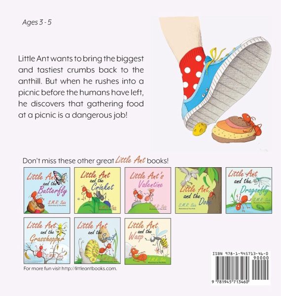 Little Ant wants to bring the biggest and tastiest crumbs back to the anthill. But when he rushes into a picnic before the humans have left, he discovers that gathering food at a picnic is a dangerous job! This is an original story that illustrates Aesop's moral: look before you leap. ABOUT THE SERIES The Little Ant Books were created with social emotional learning (SEL) in mind. Kids learn best by example. Little Ant often acts on his big feelings before taking a moment to think about what he is doing. As they see Little Ant learn from his mistakes, kids will develop a deeper understanding of their own emotions. The stories can be used as a learning tool to help kids discover the small gap that exists between feeling and acting - a gap in which thinking and choosing how we want to behave is possible, no matter how we feel. The Little Ant books are reimaginings of Aesop's classic fables, teaching timeless lessons like "appearances can be deceiving" and "one good turn deserves another." Brought to life by Tina Perko's vibrant and whimsical illustrations, the stories follow Little Ant as he navigates through the challenges and frustrations of growing up. Little Ant's adventures provide him with opportunities to build character and learn valuable lessons about friendship, kindness, empathy, teamwork, courage, and the importance of being yourself. Visit the Free Digital Downloads tab of the publisher's website (shelfspacebooks.com) for an extensive selection of companion resources to go along with the Little Ant Books, like social emotional learning (SEL) / character education lessons plans, SEL activities, and coloring books.