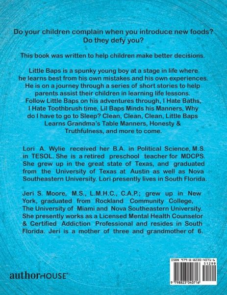 When my own children were little, they would never try new food- 30 years later, "here you go", the same version in book format. Read them to your children, and let them see what happens when you try new food. This is a great way to help your child learn what is right what is wrong. It's an educational experience. This book was written by Jeri S. Moore, MS, LMHC, CAP (therapist), mother, & grandmother of 6 who inspired me. Also, written by Lori A. Wylie, retired preschool teacher.