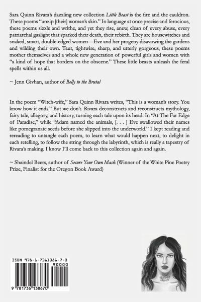 Little Beast is a collection of poems that remind us that brutality and beauty are often two sides of the same coin. Does love exist without savagery? What is the difference between motherhood and miracles? Wildlife, witchcraft, and wonder are found throughout these poems, and each pull the reader into the magic they hold. Weaving folklore with survival stories, this collection informs the reader when to fight back, when to run, and when to trust shelter when it's finally found. ** Sara Quinn Rivara's dazzling new collection Little Beast is the fire and the cauldron. These poems "unzip [their] woman's skin." In language at once precise and ferocious, these poems sizzle and writhe, and yet they rise, anew, clean of every abuse, every patriarchal gaslight that sparked their death, their rebirth. They are housewitches and snaked, smart, double-edged women-Eve and her progeny disavowing the gardens and wilding their own. Taut, tightwire, sharp, and utterly gorgeous, these poems mother themselves and a whole new generation of powerful girls and women with "a kind of hope that borders on the obscene." These little beasts unleash the feral spells within us all. Jenn Givhan, author of Belly to the Brutal In the poem "Witch-wife," Sara Quinn Rivara writes, "This is a woman's story. You know how it ends." But we don't. Rivara deconstructs and reconstructs mythology, fairy tale, allegory, and history, turning each tale upon its head. In "At The Far Edge of Paradise," while "Adam named the animals, [. . . ] Eve swallowed their names like pomegranate seeds before she slipped into the underworld." I kept reading and rereading to untangle each poem, to learn what would happen next, to delight in each retelling, to follow the string through the labyrinth, which is really a tapestry of Rivara's making. I know I'll come back to this collection again and again. Shaindel Beers, author of Secure Your Own Mask (Winner of the White Pine Poetry Prize, Finalist for the Oregon Book Award)