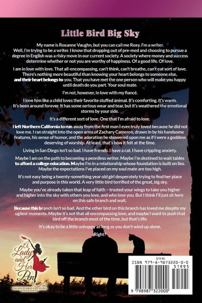 My name is Roxanne Vaughn, but you can call me Roxy. I'm a writer. Well, I'm trying to be a writer. I know that dropping out of pre-med and choosing to pursue a degree in English was a risky move in our current society. A society where money and success determine whether or not you are worthy of happiness. Of a good life. Of love. I am in love with love. That all-encompassing, can't think, can't breathe, can't eat sort of love. There's nothing more beautiful than knowing your heart belongs to someone else, and their heart belongs to you. That you have met the one person who will make you happy until death do you part. Your soul mate. I'm not, however, in love with my fiancé. I love him like a child loves their favorite stuffed animal. It's comforting. It's warm. It's been around forever. It has some serious wear and tear, but it's weathered the emotional storms by your side. It's a different sort of love. One that I'm afraid to lose. I left Northern California to run away from the first man I ever truly loved because he did not love me. I ran straight into the open arms of Zachary Cameron, drawn in by his handsome features, his sense of humor, and the adoration he showered upon me as if I were a goddess deserving of worship. At least, that's how it felt at the time. Living in San Diego isn't so bad. I have friends. I have a cat. I have crippling anxiety. Maybe I am on the path to becoming a penniless writer. Maybe I'm destined to wait tables to afford a college education. Maybe I'm in a relationship whose foundation is built on lies. Maybe the expectations I've placed on my soul mate are too high. It's not easy being a twenty-something year old girl desperately trying to find her place and purpose in this world. A very little bird terrified of the great, big sky. Maybe you've already taken that leap of faith - trusted your wings to take you higher and higher into the sky with others you love, and who love you. But I think I'll just sit here on this safe branch and wait. Because this branch isn't so bad. And the other bird on this branch has loved me despite my ugliest moments. Maybe it's not that all encompassing love, and maybe I want to push that bird off the branch most of the time, but that's life. It's okay to be a little unhappy as long as you don't wind up alone. Right?