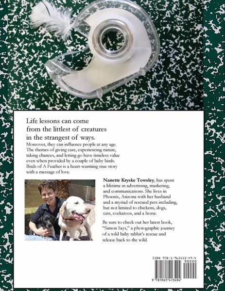 Life lessons can come from the littlest of creatures in the strangest of ways. Moreover, they can influence people at any age. The themes of giving care, experiencing nature, taking chances, and letting go have timeless value even when provided by a couple of baby birds. Birds of A Feather is a heart-warming true story with a message of love. Nanette Kryske Towsley, has spent a lifetime in advertising, marketing, and communications. She lives in Phoenix, Arizona with her husband and a myriad of rescued pets including, but not limited to chickens, dogs, cats, cockatoos, and a horse. Be sure to check out her latest book, "Simon Says," a photographic journey of a wild baby rabbit's rescue and release back to the wild.