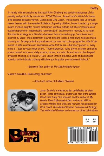 Jason Emde's poems in little bit die are intimate and haunted recollections of travel and freedom, of friendship and loss, of leaving and getting home. Careening from small-town Canada to Zimbabwe to Mexico to Poland to Tiananmen Square to Gifu, Japan, Emde traces how the heart moves through its spheres of grief and the ways it endures "in the middle of the noise." "It's a fantastic book; it broke my heart and made me laugh at the same time. Does it get any better than that?" -Susan Musgrave, author of Exculpatory Lilies "In heady intimate anaphoras that recall Allen Ginsberg and ecstatic catalogues of rich plurality and particularity reminiscent of Walt Whitman, Jason Emde's little bit die traces a life bisected between Vernon, Canada and Gifu, Japan. These poems lead us through streets layered with the repeated footsteps of growing children, hotels haunted by a single night's drunken laughter, houses that remain identical outside but where "modern-sleek" updates replace the "indescribable nameless junk" that lives on in memory. At its heart, this book is an elegy for a friendship between "two non-macho guys / who loved each other for 30 years" and a testament to what it means to lose a friend who holds so much shared past. Emde plumbs the paradoxes of our inner and outer geographies. little bit die leaves us with a curious and wonderous sense that we are-that every person is, every place is-"just as vast / inside as out." These digressive, voice-driven, strange, and funny poems remind us how our daily errands, chores, and acts of care touch on the deepest mysteries of being. Like Frank O'Hara, Jason Emde's infectious voice and astonished attention to the intimate ordinary will follow you long after you set down this book." -Bronwen Tate, author of The Silk the Moths Ignore "Jason's incredible. Such energy and vision" -John Lent, author of A Matins Flywheel Jason Emde is a teacher, writer, undefeated amateur boxer, Prince enthusiast, creator and host of the Writers Read Their Early Sh*t podcast, and the author of My Hand's Tired & My Heart Aches. He has an MFA in Creative Writing from UBC and his work has appeared in Real Travel, The Malahat Review, Soliloquies Anthology, The Watershed Review, and numerous other publications.