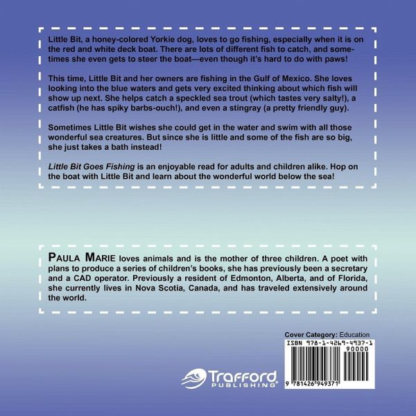 Little Bit, a honey-colored Yorkie dog, loves to go fishing, especially when it is on the red and white deck boat. There are lots of different fish to catch, and sometimes she even gets to steer the boat-even though it's hard to do with paws! This time, Little Bit and her owners are fishing in the Gulf of Mexico. She loves looking into the blue waters and gets very excited thinking about which fish will show up next. She helps catch a speckled sea trout (which tastes very salty!), a catfish (he has spiky barbs-ouch!), and even a stingray (a pretty friendly guy). Sometimes Little Bit wishes she could get in the water and swim with all those wonderful sea creatures. But since she is little and some of the fish are so big, she just takes a bath instead! Little Bit Goes Fishing is an enjoyable read for adults and children alike. Hop on the boat with Little Bit and learn about the wonderful world below the sea!