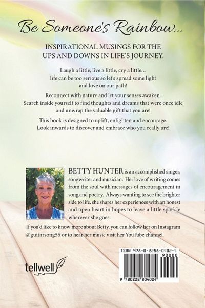 Be Someone's Rainbow... Inspirational musings for the ups and downs in life's journey. Laugh a little, live a little, cry a little... life can be too serious so let's spread some light and love on our path! Reconnect with nature and let your senses awaken. Search inside yourself to find thoughts and dreams that were once idle and unwrap the valuable gift that you are! This book is designed to uplift, enlighten and encourage. Look inwards to discover and embrace who you really are!