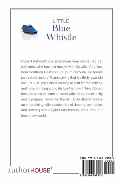Robert Ashcroft is a sixty-three year old retired car salesman who has just moved with his wife, Veronica, from Southern California to South Carolina. He learns just a week before Thanksgiving that his thirty year old son, Paul, is gay. Paul is coming to visit for the holiday, and he is bringing along his boyfriend with him. Robert has one week to come to terms with his son's sexuality and to prepare himself for the visit. Little Blue Whistle is an entertaining rollercoaster ride of dreams, memories, and subsequent insights into fathers, sons, and our brave new world.